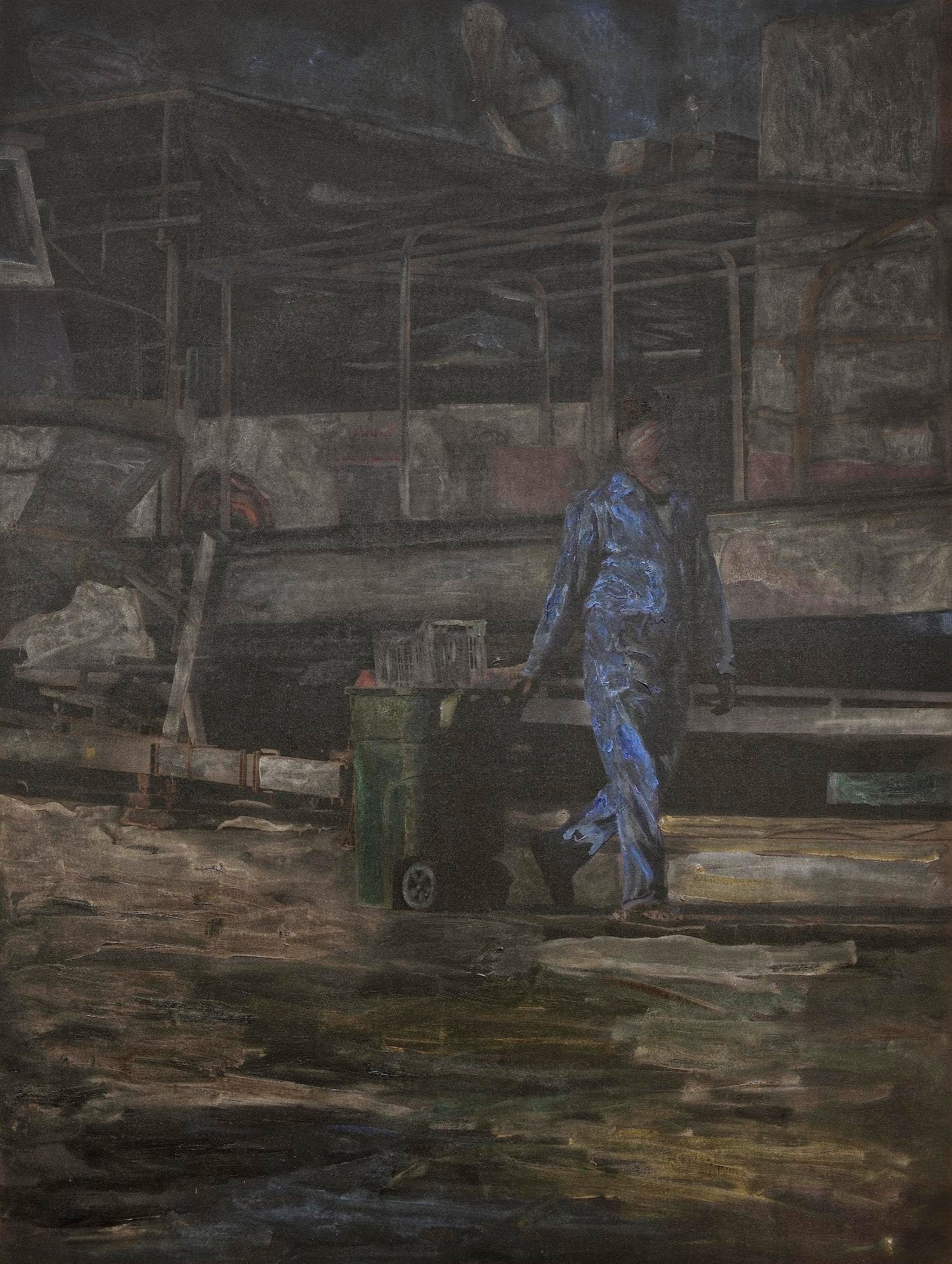 “In seeking to reveal what is habitually concealed, Mohammed Kazem acts as an agent of resistance. The six canvases in his series Even the Shade Does not Belong to Them, based on photographs he took in the street, portray labourers working on building sites. It seems as if we are looking at the protagonists, painted in acrylic and dark ink, through a murky glass. The effect conveys how the labourers, though always there, often go unnoticed. “People look right through them” notes the artist. “