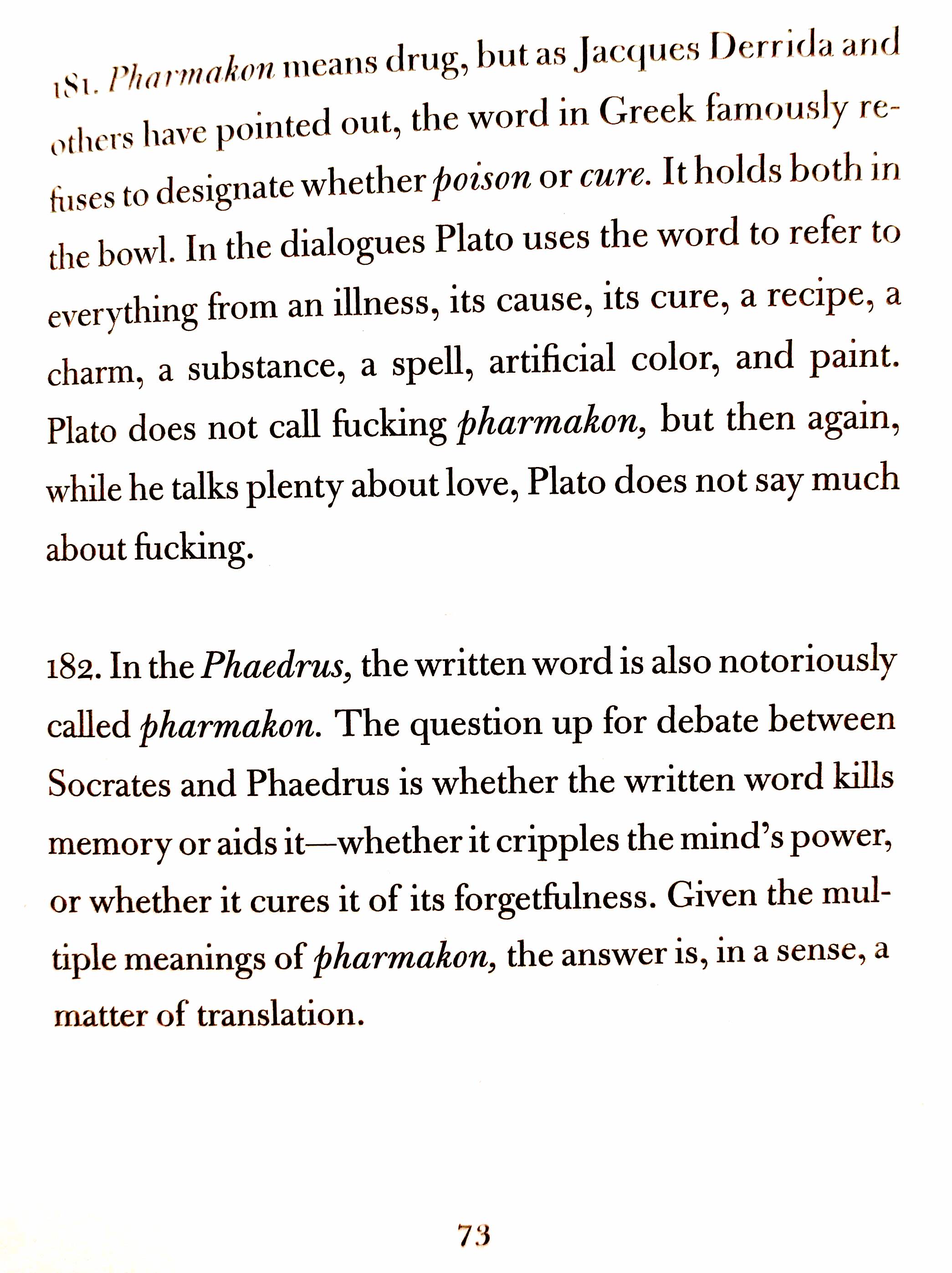 This excerpt from Bluets by Maggie Nelson highlights the ambivalence of the greek term pharmakon. Bluets is an essay where the autor reflects around the color blue, its cultural use as well as intimate thoughts, melancolia, and the role of writing.